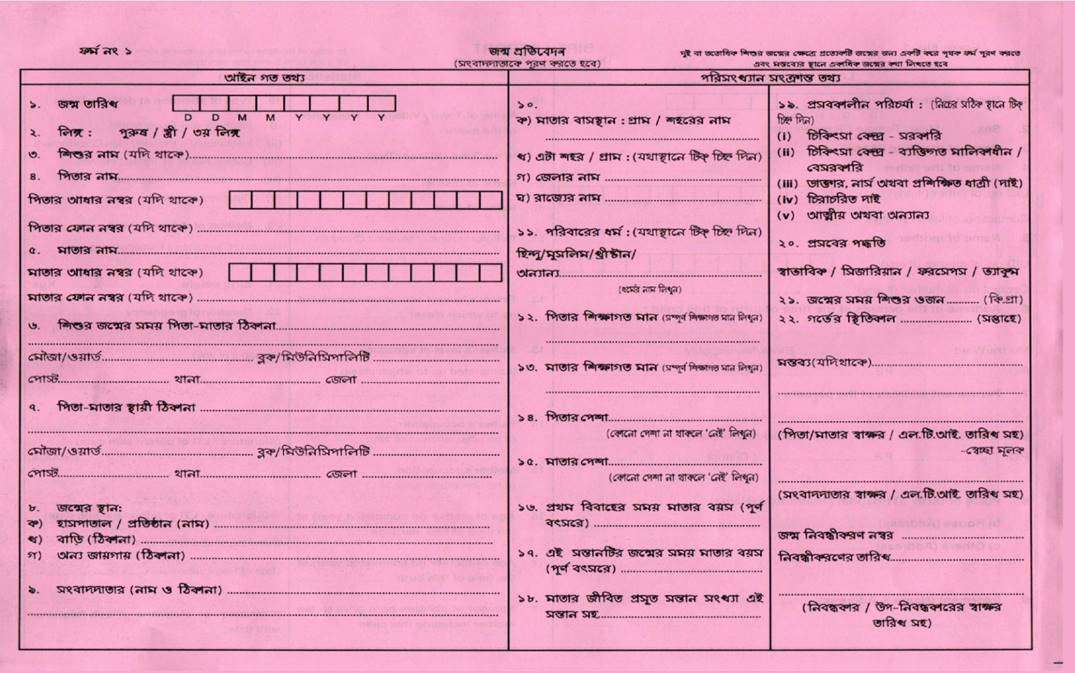 - Form No. 1 – Birth Report [ English Form | Bengali Form ]
