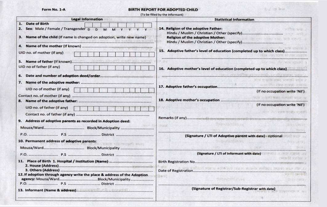 - Form No. 1A – Birth Report for Adopted Child [English Form | Bengali Form]